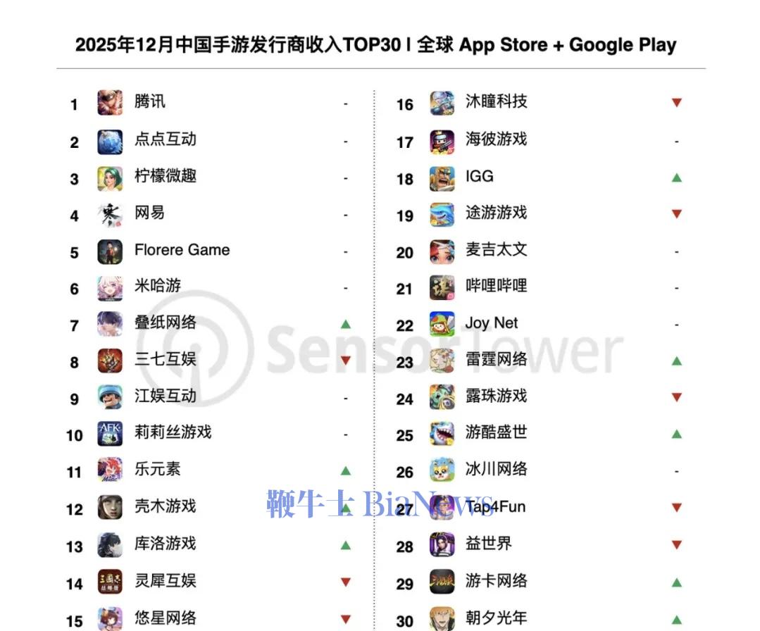 数据显示,腾讯强势卫冕2025年12月全球手游发行商收入冠军,旗下王牌产品矩阵多点爆发,营收势能持续拉满。