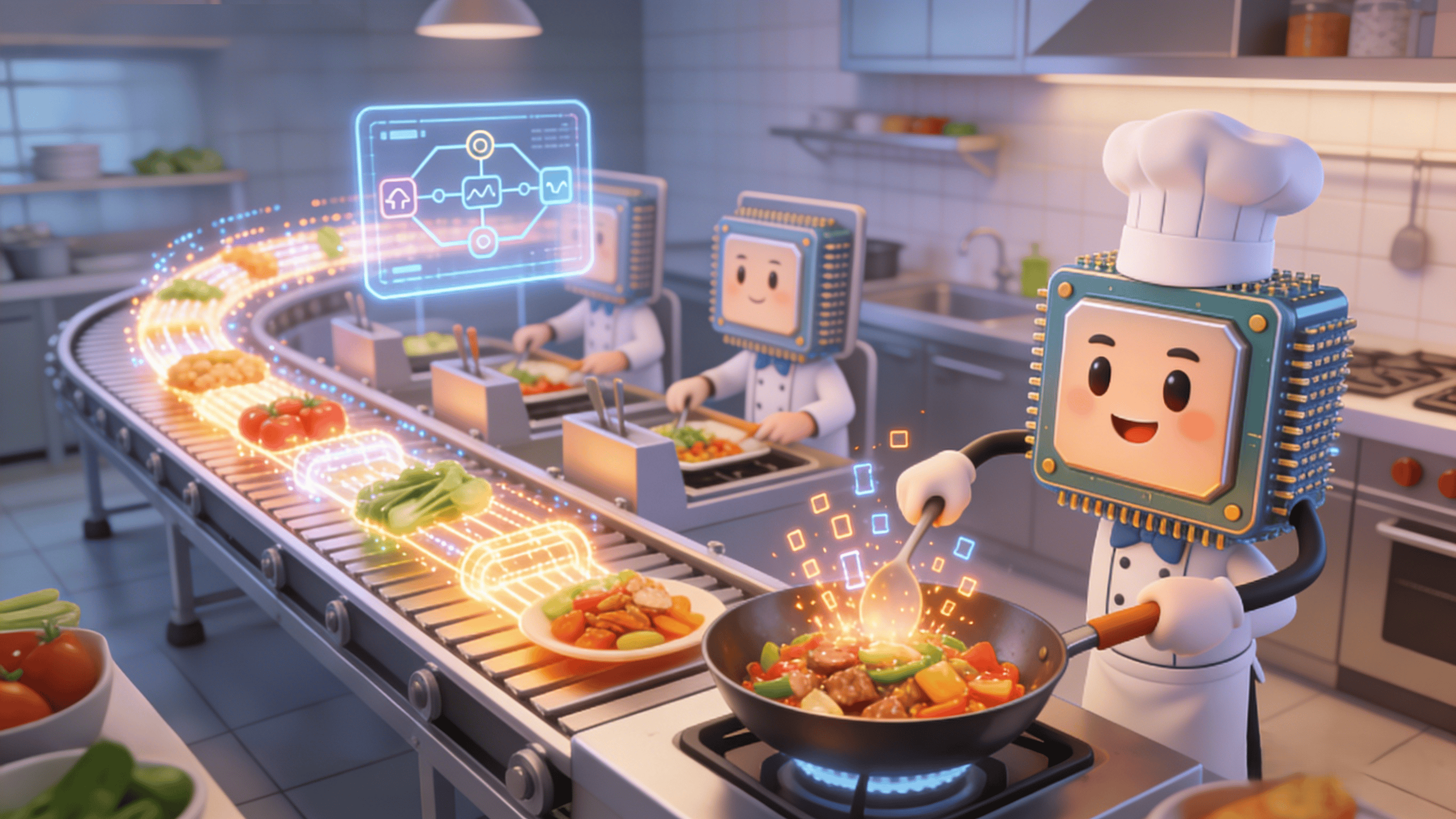 它能随时改变配菜的流水线(算法),想吃煲仔饭、小炒肉、佛跳墙……流水线随时变,又快又好。