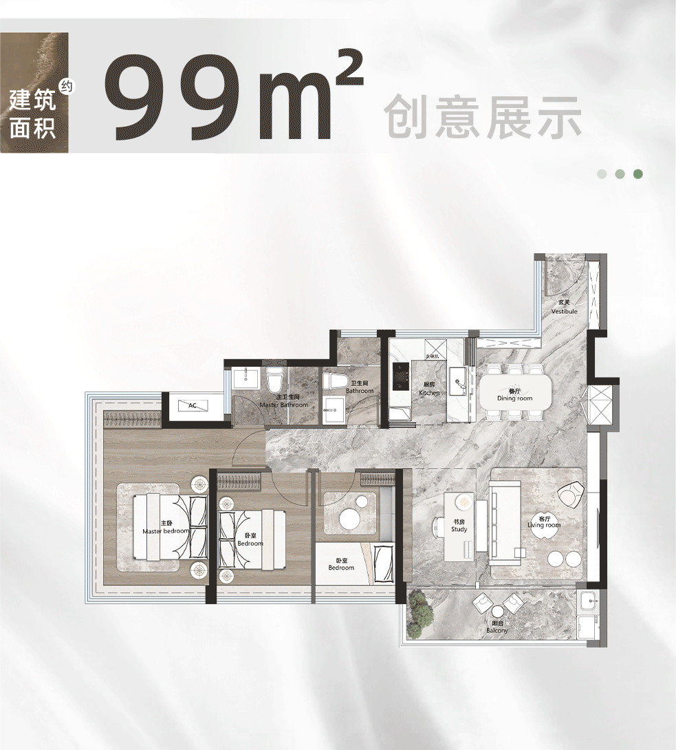 建面约99㎡的四房两卫户型,是改善型客户的热门选择。该户型被誉为IMAX宽景阳台”设计,主卧采用三面环幕视野,室内就像一座移动的观景台。