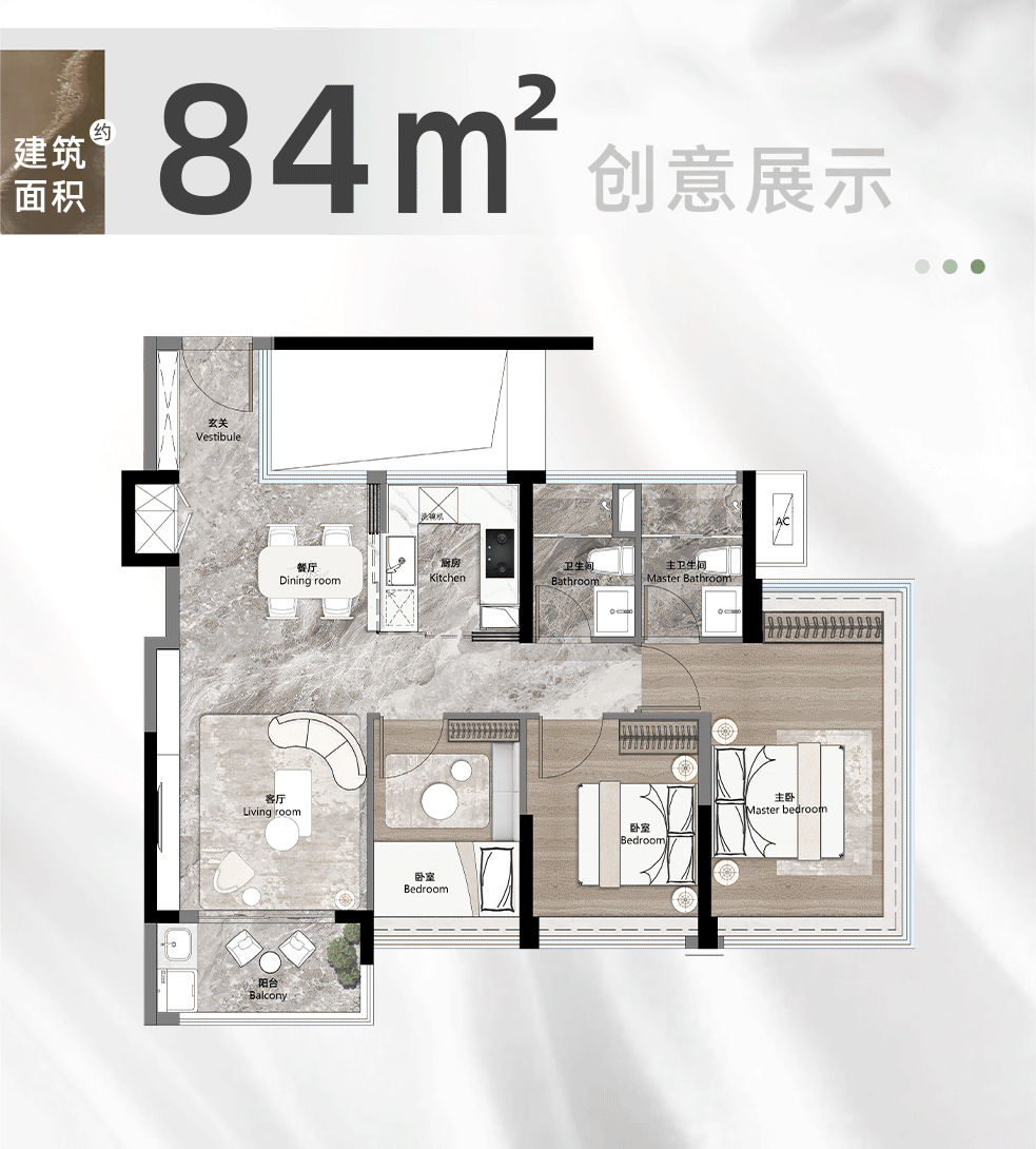 无论是在房间数量,还是在空间尺度、景观采光上,99㎡户型都进行了“超级加倍”,完美诠释了“小而美”的居住哲学。