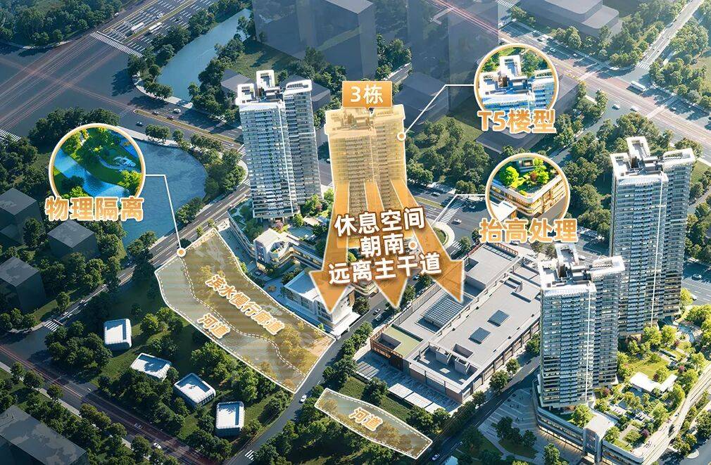 嘉悦云启的3栋楼采用了T5楼栋+全南向布局”的科学设计。这种设计将休憩空间与公共区域都朝向南侧,直面绿化廊道和河道。同时,楼间距奢阔,有效隔离了主干道的车流噪音,保证了室内的安静。